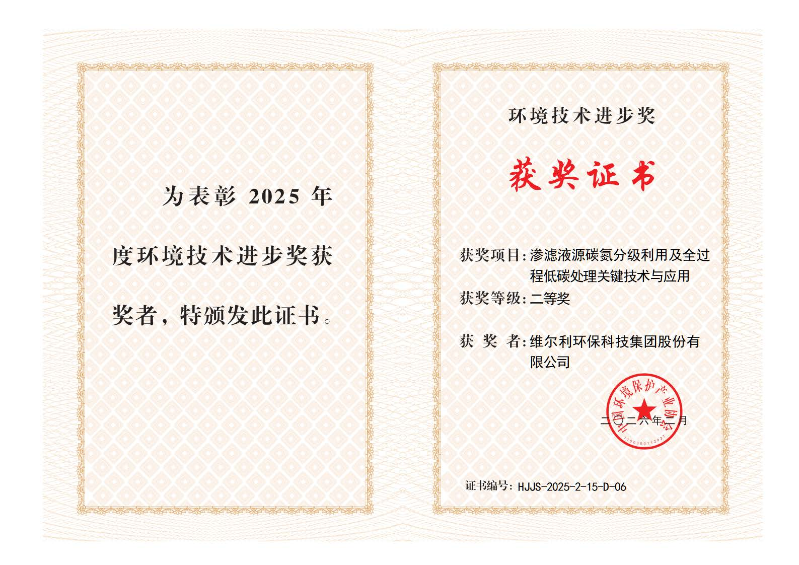 喜报|维尔利双奖加身!斩获2025年度环境技术进步奖一、二等奖